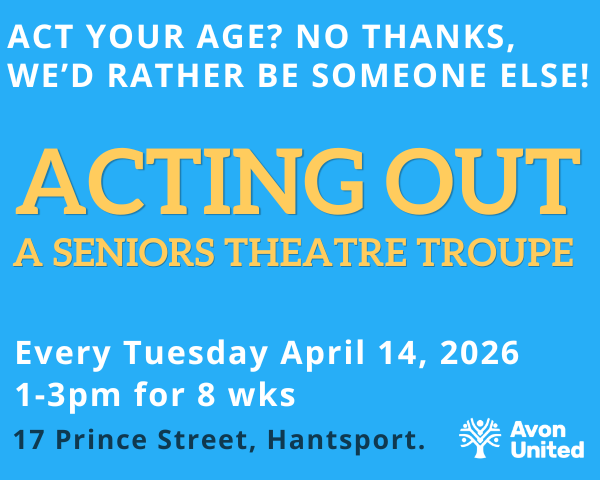 Acting Out – Senior Theatre Troupe + Add to Google Calendar + iCal / Outlook export 00 days 00 hours 00 minutes 00 seconds Date Apr 14 2026 Time 1:00 pm - 3:00 pm Location Avon United Church - 17 Prince St. Hantsport Organizer Calendar for AUC Website Email b38f8b0055f307296a72901dd54b969577e7ad1836a517cfec088ff93972b744@group.calendar.google.com Share this event